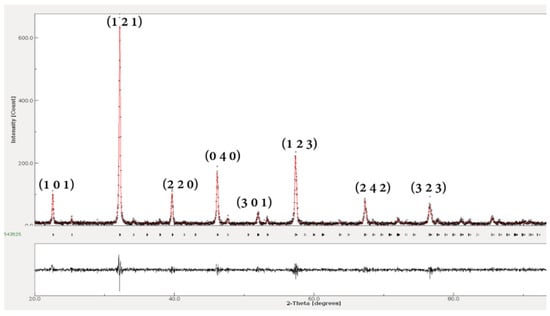 The crystalline structure analysis using XRD pattern is shown in Figure 4. A single orthorhombic structure of Pnma space group was identified (JCPD #000330701). The Rietveld refinement of X-ray diffraction pattern shows that compound has the following lattice parameters: a = 5.56 , b = 7.85 and c = 5.55 , corresponding to a cell volume of 342.62 (Figure 4). The profile reliability factors Rp = 5.68 and Rwp = 7.38 show a good fit between the calculated diagram and the observed data. The results are in adequation with those of the orthorhombic (pnma space group) perovskite-type oxides of the lanthanum chromite [44].