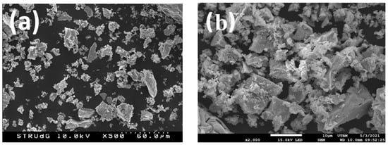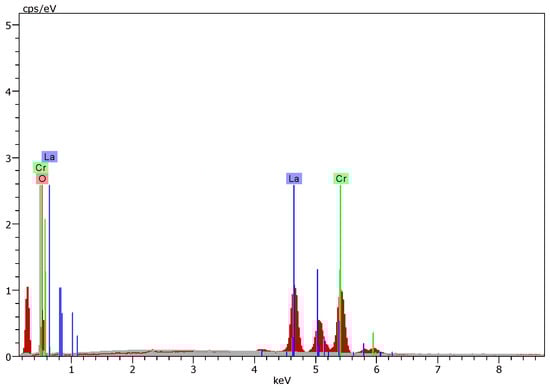 SEM micrographs of the powder are presented in Figure 5 before and after hydrogenation of the compound LaCrO3. The powder from the sol-gel process is irregularly shaped, non-spherical and its particles are less than 18 μm. The appearance of cracks due to hydrogen embrittlement during the hydrogenation phase was observed. In addition, grain distribution was similar after hydrogenation. EDX analysis, Figure 6 shows that the peaks corresponding to constituent elements (La, Cr and O) exist in amounts corresponding to composition. The powder resulting from the Pechini sol-gel process was irregular in shape, not spherical, and its particles have a size of less than 18 µm.