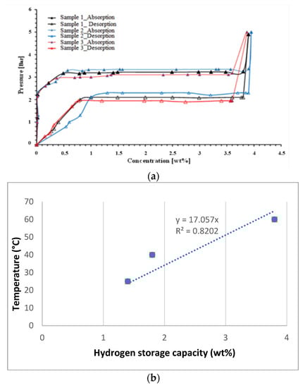 The pressure-composition temperature (PCT) curves for hydrogen absorption and desorption for were generated at three temperatures: 298 K, 313 K and 333 K. PCT curves in Figure 7a show that this hydride exhibits a single plateau at all experimental temperatures.