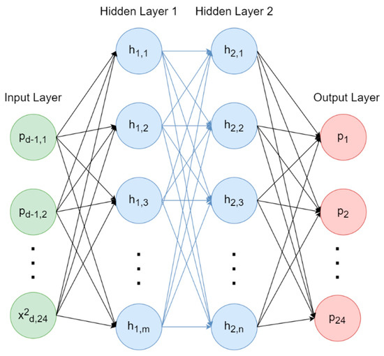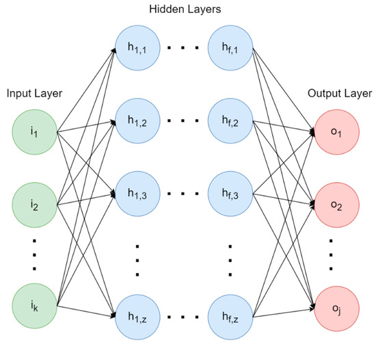 The feedforward deep neural network is an acyclic artificial neural network [45] that follows a simple layer structure and extends the MLP architecture for the purposes of function approximation. The base unit of the feedforward DNN is the neuron which is a node designed to receive a specified number of inputs, perform computations and pass the output to connected nodes found deeper in the network. The value of the output at each node is determined by activation functions, such as the rectified linear unit and hyperbolic tangent [46]. The neurons of the DNN are organized into layers and the connections of those layers denote the computation path from the input to the output. The simplest and most frequently used DNN structure contains the input layer, where input features are passed to the first set of neurons, several hidden layers that perform additional computations and tune the learnable parameters of the network, and the output layer where one or more output values are generated at each node. For the purposes of this study, we consider the role of the feedforward DNN for the supervised learning task of regression [47] since we focus on the prediction of the electricity price for the next day. Based on this task, the goal of the DNN is to learn the mapping function that describes the complex relationship between the input variables and the output variables. As a general example, we consider the fully connected DNN presented in Figure 1. The DNN features an input layer containing inputs, a variable number of hidden layers , where each one contains a variable number of neurons and, finally, an output layer containing neurons for the predictions of outputs.