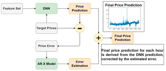 Following this step, the residual error sequences are fed to an autoregressive model for their step-by-step estimation, resulting in the derivation of coefficients that are used to predict the error value of the next hour based on historical error data. The final price prediction is derived from the addition of the estimated error and the price forecast of the feedforward DNN. The structure of this model is presented in Figure 2 and this forecasting approach is used in our case study featuring several experiments on different training scenarios for the interpretation and analysis of the error compensation process. We refer to this model as ERC–DNN in the remainder of this paper.
