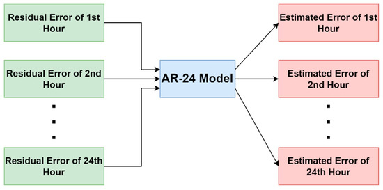 The DNN is trained and the sequences for price prediction are generated at the output. The experiments presented in this work consider three training scenarios, with 10, 100 and 1000 epochs, respectively, for the investigation of error compensation in a scenario where the values of error are large and the network is not near convergence, a moderate scenario where the error has improved but there is still room for further training and a training scenario where the error of the network could marginally improve after a large number of epochs. In all three experiments, the residual error sequences for each hour are calculated and their stationarity is verified by the augmented Dickey–Fuller test. Additionally, the inspection of the partial autocorrelation function for each error sequence reveals that after the first 24 lags the partial autocorrelations decay to values near zero. The results of the stationarity test as well as the observation of the partial autocorrelation function encourage the integration of an autoregressive model for the estimation of each error sequence. Therefore, the residual error sequences are passed to an AR model utilizing a window of 24 lags for the prediction of the next value of error in each sequence. After the fitting of the model to the data, the autoregression coefficients are computed and the estimated hourly error sequences are added to the electricity price forecasts for the refinement of the final prediction. Furthermore, the information criteria of AIC, BIC and HQIC were examined for the suitability of the 24-lag autoregressive model and the potential refinement of the model selection process when a threshold for feature autocorrelation is set at 0.2, 0.3 and 0.4. This additional experiment could contribute towards the appropriate selection of hyperparameters that could be included in future benchmarks adopting this technique for post-prediction processing of the model. Since hyperparameter optimization for this type of forecasting task already considers a sizable set of hyperparameters, the choice between the window length and the more complex threshold inspection based on information criteria could often be an important decision that could determine the size of the search space and the overall computational burden for the recalibration of a model or benchmark, given that short-term and real-time forecasting models need to recalibrate relatively fast. Figure 4 presents the diagram for the autoregressive model of the ERC–DNN used in the experiments.