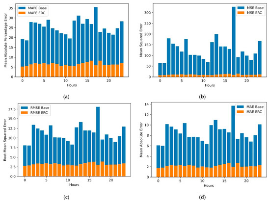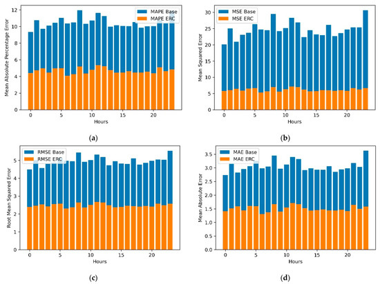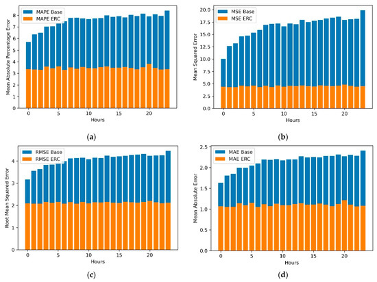 The second experiment considers the training scenario of 100 epochs. In this task, the neural network reaches a more acceptable forecasting performance with each hourly sequence having similar error metrics. As can be observed from the subplots of Figure 6, there are slight error variations between the hourly sequences showing that the network is still unable to predict every hour of the day-ahead prediction equally well. The effect of error compensation in the ERC–DNN improves the forecasting performance and the error metrics are lower than those presented in the open-access benchmark. Since neural network models on sufficiently large datasets do not typically converge after 100 epochs and the values of error are not distinctly high, the slight error variations observed in the baseline evaluation are passed down to the ERC–DNN. Therefore, when compared to the 10-epoch scenario, the performance of the model improved in a similar way but the stability improvement of error among hourly sequences was not as drastic.