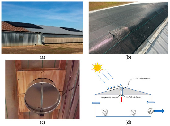 Six, black, metal-fiber-enforced and nylon-based solar collectors (Southwestern Sales Co., Springdale, AR, USA) were installed on south-facing rooftops of a commercial-scale broiler house (test house, dimension of 12 × 122 m), with a roof pitch of 3/12 (Figure 1a). The farm uses whole-house brooding, with 4 exhaust fans of 0.9 m diameter used for minimum ventilation. Each collector has approximately 36 m2 surface area. The collectors were raised 22 cm above the galvanized metal roof (Figure 1b). Under each collector and close to the ridge of the house, a 50 cm diameter opening was made on the sheet metal roof to duct the air underneath the collector to the interior of the house (Figure 1c,d). A stir fan (FAN18-STD, Southwestern Sales Co., Springdale, AR, USA) was mounted inside the duct and wired to the collector’s controller to push air down when activated. Solar heating was allowed by opening a flat-disk, round damper on the bottom of the duct, allowing fresh air in the plenum into the house. An adjacent house with no collector served as control.