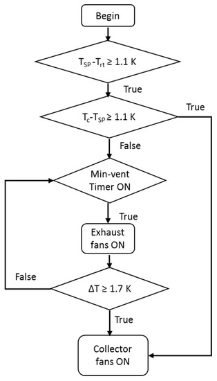 When the bird-level real-time temperature (Trt) was close to or higher than the target setpoint temperature (house in transition to cooling), collectors were disallowed to operate. When the house was in need of heat, the solar collectors were in operation when one of two conditions was met (Figure 2). First, when the temperature under the collectors (Tc) was higher than the house target temperature (Tsp), fresh warm air under the solar collectors was delivered into the house under constant heat mode. This allowed the solar collectors to be used as heaters, delivering additional warm air to the house independent of the min-vent timer, in comparison with the control house without solar collectors. The house was likely in neutral or slightly positive pressure during the heating mode as the air inside the house likely exits through cracks on the wall. Secondly, during the ON cycle of minimum ventilation (Intermittent mode), the fans inside the ducts were activated (simultaneously) in sync with the four exhaust fans. Fresh air enters the buildings through either the sidewall inlets or six collector duct openings.