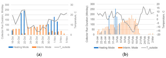 Daily operating duration of solar collectors. (a) a fall flock with preheating on 10/18 and chick placing on 20 October 2020; (b) a winter flock with preheating on 1/19 and chick placing on 22 January 2021.