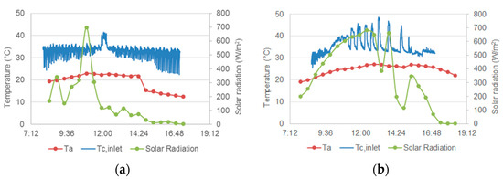 When Tc was higher than Tsp, and Tsp was higher than Ta, solar collectors operated as heaters to deliver warm air from the collector plenum continuously into the barn (Figure 4b), until the Tc fell below the Tsp or Ta rose above Tsp. When in operation, solar collectors were able to raise the daytime daily average temperature of the incoming air up to 20 K (Figure 5).