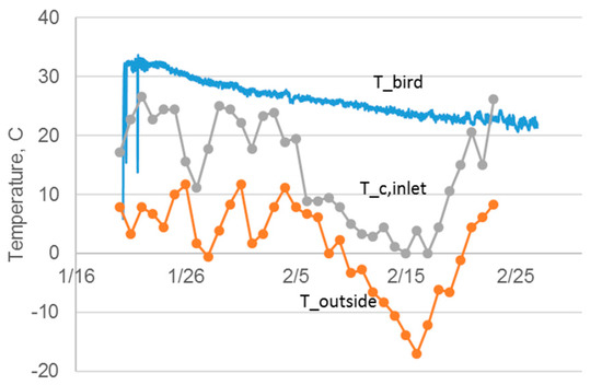 The cumulative length of solar collectors in operation each day averaged 133 min (a range between 60 min and 303 min) (Figure 3b) during the first 33 days of the winter flock. During this period, solar collectors operated as heaters for 7 days. February 2021 was an extremely cold winter month in this region with historically low temperatures (−15 °C) and snowstorms from 13–16 February.