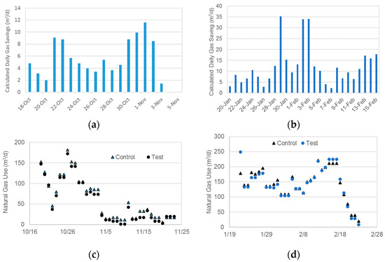 (a) Calculated natural gas savings of a fall flock due to solar heating; (b) calculated natural gas savings of a winter flock due to solar heating; (c) daily natural gas readings of meters in the test and control houses of the fall flock; (d) daily natural gas readings of meters in the test and control houses of the winter flock.