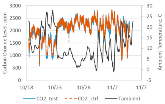Building CO2 concentrations are indicators of indoor air quality and are results of a combination of interior CO2 generation rates (from birds and litter) and building ventilation rates. Carbon dioxide concentrations in both test and control houses are shown in Figure 7. Lower CO2 levels of 1000 ppm during the daytime of 21–22 October 2020 were likely a result of low gas consumption (Figure 7). The similar concentration level in test and control houses indicated that the additional ventilation provided by solar collectors as heaters during several sunny days did not make a substantial difference in air quality between the test and control houses.