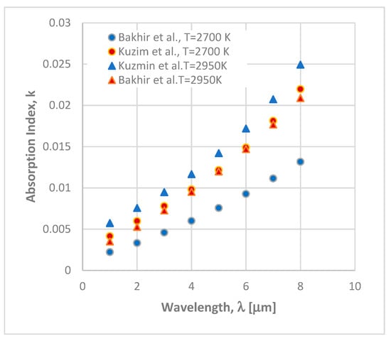 Figure 1 shows the absorption index numbers at different temperature values and over the wavelength from 0.5 to 8 μm based on the two analytical relationships. It is clearly shown that there are differences in the two analytical relationships of the absorption coefficient of alumina in function of temperature and spectral wavelength. The differences between the two different models increase with the rise in the wavelength. The refractive index calculated with the analytical expression of Kuzmin et al. [11] is approximately 1.8 in the wavelength range from 0.5 to 8 μm.