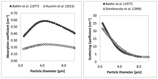 Absorption coefficient (on the left) and scattering coefficient (on the right) for different alumina particle diameters. Reprinted with permission from [10,11,15].
