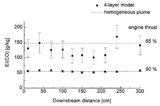 CO emissions at two different thrust levels for the engine ~65% and 90% taken at different locations downstream of the M701TZ engine. Reprinted with permission from Ref. [27] (1997).