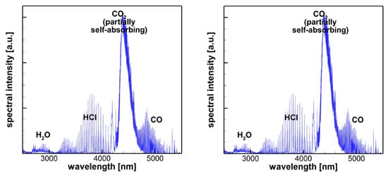 The “overview to the ESA-EMAP project: characterization of SRM plumes with alumina particulate in subscale testing” of Saile et al. [28] deals with the experimental study of alumina particulates in solid rocket engines. In this work, the focus is on those particles that remain in the atmosphere after a solid rocket vehicle has passed. Fourier transform-based emission spectroscopy (FTIR) was performed with an ABB MR 304 spectroscope, which works between 1 and 8 µm and provided the results shown in Figure 5. In conclusion, spectroscopy allows one to precisely define the intensity as a function of the wavelength, and it provided the results in the study of the temperature of gases and particles.