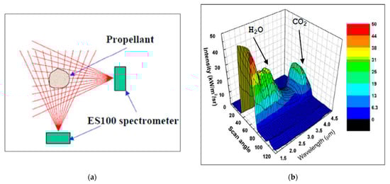 Devir [30] applied an FT-IR spectrometer to characterize the irradiance of a small solid fuel engine. Wang [31] used the FTIR method to characterize the infrared radiation signature of the exhaust gases of a solid rocket engine with three different propellant types, all with the double base but with different energetic characteristics. The infrared spectral radiance was measured in the range between 1000 and 4500 cm−1. The results demonstrated that the energetic characteristics of the propellants affect the infrared radiation of the plume. FT-IR spectrometer measurements were also used to validate the numerical model.