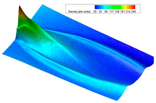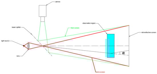 In the aerospace applications, in which many phenomena to be observed are characterized only by compressible effects with little changes in the refraction index, a double-pass configuration with a retroreflective screen is implemented to improve the sensitivity to low-density variation. This layout is called retroreflective shadowgraph [38]; see Figure 14. In this case, the beam splitter points the image directly on the camera, using an “on-axis” layout, it permits one to avoid doubling some regions of the image due to the angle of the axis of the illuminating light with the axis of the camera.