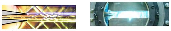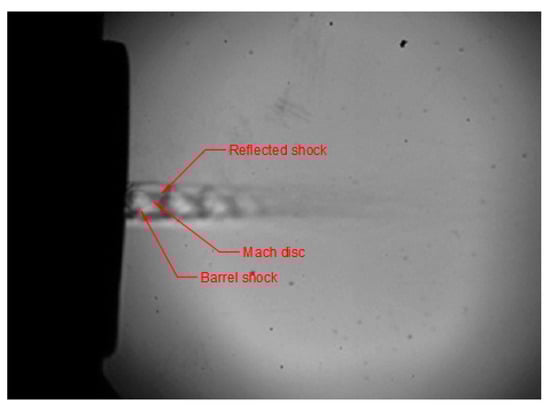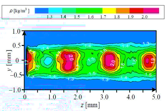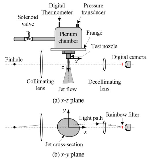 - Maeda, H.; Fukuda, H.; Nakao, S.; Miyazato, Y.; Ishino, Y. Rainbow schlieren measurements in underexpanded jets from square supersonic micro nozzles. EPJ Web Conf. 2018, 180, 02058. [Google Scholar] [CrossRef]