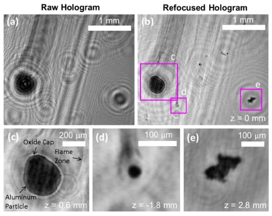 Alumina hologram, (a) Raw Hologram; (b) Refocused Hologram at z = 0; (c–e) are refocused holograms with different z values (depth of the recorded volume), to focus on specific particles. Reprinted with permission from Ref. [48] (2017).