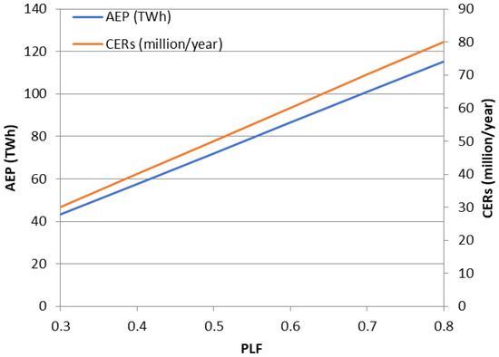 The above estimates are based on the assumption of 60% PLF. With 60% PLF the gross AEP potential has been estimated at 86.46 TWh. It can easily be understood that the AEP and corresponding CER and revenue generation are highly sensitive to PLF. The PLF is highly variable and can be impacted by various operating parameters such as instructions from operators in case of grid-connected projects, seasonal constraints, etc. A sensitivity analysis has been performed to study the effect of PLF on AEP and corresponding CER generation potential and the results of this sensitivity analysis are presented in Figure 1.