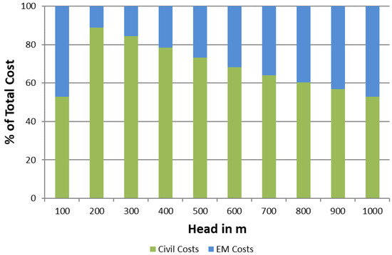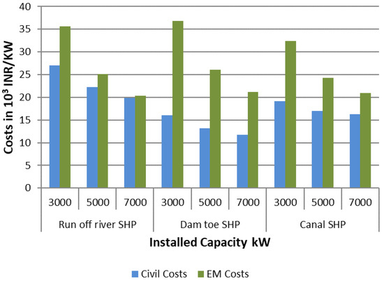 - In all the three cases of low head SHP via dam toe, run-off-the-river, and canal-based schemes, the costs of electro-mechanical work were more than civil works, as illustrated in Figure 2. This is because, in low head SHP schemes, the machine sizes are relatively larger, the size of powerhouse building and other civil works components are directly affected by the type and size of machines and, hence, electro-mechanical equipment has a bigger cost contribution than civil works. However, for high head SHP plants, civil works costs are more than electro-mechanical components cost works as illustrated in Figure 3. This is because the capital investment of medium and high head SHP schemes are governed by the civil works cost as these schemes are site specific.