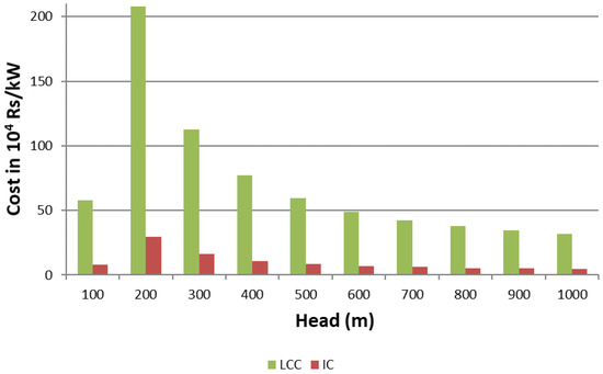 - IC, which is a combination of cost of civil works, electro-mechanical components and administrative, charges is more for SHP with low head and capacity. This decreases with an increase in head or capacity of the plant as illustrated in Figure 4 and Figure 5 for low and high head SHP plants, respectively.