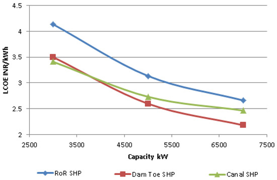 Figure 6. Variation of LCOE w.r.t capacity for low head SHP schemes.