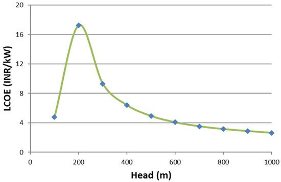 Figure 7. Variation of LCOE w.r.t head for 2000 kW high head SHP schemes.