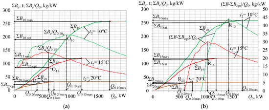 A maximum rate of annual fuel reduction ΣBe increment ΣBe/Q0 for ta2 = 10 °C takes place at the optimum design cooling capacity Q0.opt of about 900 kW (Figure 1a). A maximum rate of annual fuel reduction increment Σ(Be − Be.opt)/Q0 within the range beyond the value ΣBe.opt = 190 t corresponding to Q0.opt = 900 kW takes place at the rational design cooling capacity Q0.rat = 1450 kW and provides annual fuel reduction ΣBe.rat = 250 t that is very close to its maximum value 260 t but at a reduced design cooling capacity Q0.rat = 1450 kW less than Q0.max = 1700 kW by 15%.