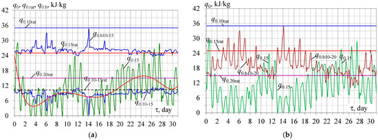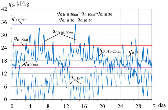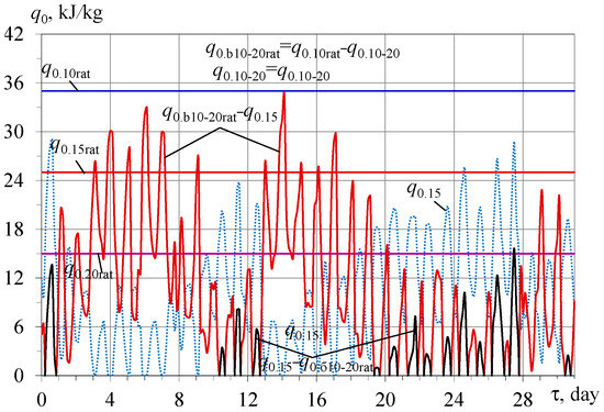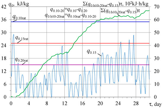 Because of the large fluctuations in the available design boost cooling capacity q0.b10-20rat for cooling ambient air to 20 °C, the corresponding excess available boost cooling capacity q0.b10-20rat − q0.15 over required q0.15 for cooling air 15 °C, and the deficit of the boost cooling capacity q0.15 − q0.b10-20rat, it is problematic to estimate the daily accumulated excess of the design cooling capacity over its required value q0.15 for cooling air to 15 °C during the month (Figure 5).