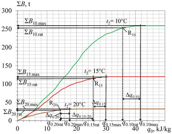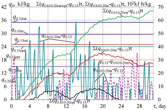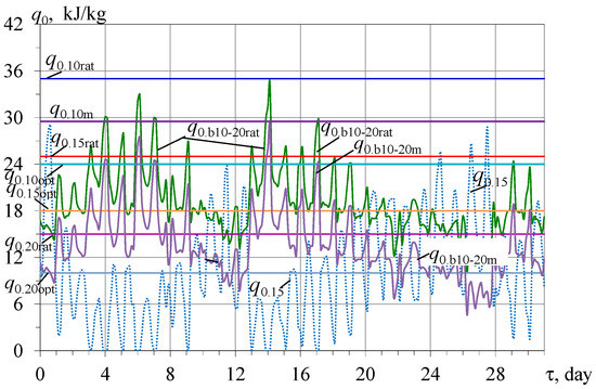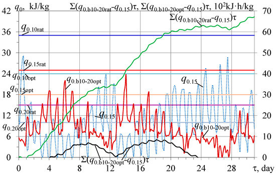 As Figure 10 shows, changing the design cooling capacities from q0.10rat to q0.10opt, the middle q0.10m and rational value decreased by 3 kJ/kg as q0.10rat-3 enables the regulation of the character of the curves of the summarized available accumulated refrigeration energy excesses Σ(q0.b10-20rat − q0.15)τ, Σ(q0.b10-20opt − q0.15)τ, and Σ(q0.b10-20m − q0.15)τ and decreased the rational value Σ(q0.b10-20rat-3 − q0.15)τ accordingly.