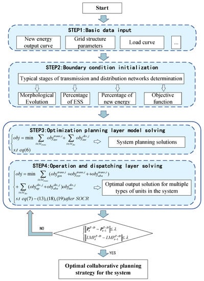 A DC power flow-based transmission network planning model and an AC power flow-based distribution network planning model are constructed. The transmission and distribution network wind-PV-ESS cooperative convex optimization model is then obtained by second-order cone relaxation (SOCR).