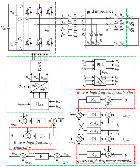 It can be found that the HFR issue of the grid-connected converter have been widely concerned, while it should be noted that these damping strategies mentioned above are only suitable for three-phase three-wire system. When it comes to three-phase four-wire systems, these methods are not completely applicable, because the zero-sequence component will also cause high-frequency resonance in addition to the positive-sequence component and the negative-sequence component [26]. Ref. [26] established the impedance models of positive-sequence, negative-sequence and zero-sequence, which reveals that the positive-sequence, negative-sequence and zero-sequence components all may bring small signal instability problems. However, the strategy to solve these stability problems has not been proposed. Due to the decoupled relationship between zero-sequence components and positive-sequence, negative-sequence components, the resonance problems caused by the zero-sequence components cannot be solved by the existing HFR suppression strategies which are applied to the positive-sequence and negative-sequence components.