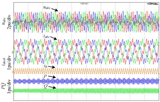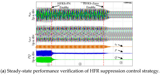 Figure 13 shows the Steady-state performance verification of HFR suppression control strategy. There are three stages in Figure 13a. State ① shows the voltages, currents, active power and reactive power of the TFSCI when HFR occurs. It can be seen that there are high frequency harmonics in the inverter’s voltages, currents, active power and reactive power. State ② shows waveforms when only HFR suppression of positive-sequence and negative-sequence is enabled. It can be seen that the resonance caused by the positive-sequence and negative-sequence components is well suppressed after enabling the HFR suppression of positive-sequence and negative-sequence. However, there are still high-frequency resonance caused by zero-sequence component in the system. State ③ shows the waveforms after further enabling HFR suppression of zero-sequence, which shows that the resonance caused by the zero-sequence component has been well suppressed.