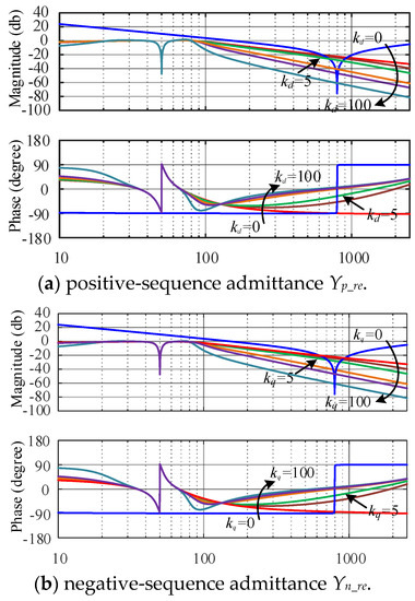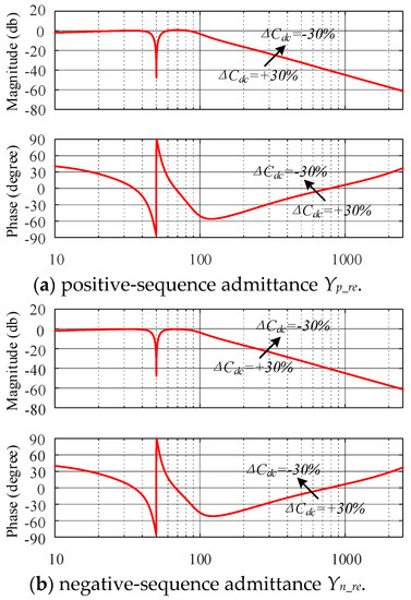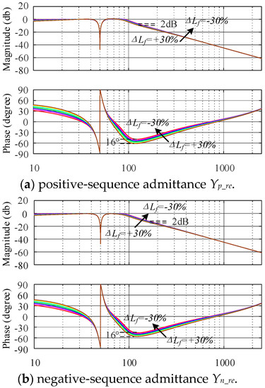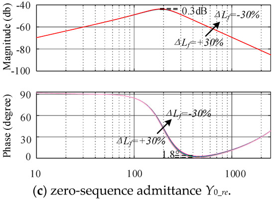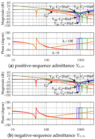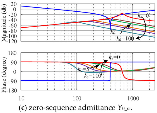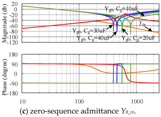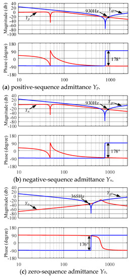 The Bode diagram of the inverter admittance after the simplification is shown in Figure 6. In Figure 6, Yp, Yn, and Y0 represents the admittance of the inverter after simplification, Ygp, Ygn and Yg0 are the admittance of the grid.