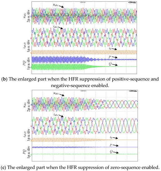 Figure 13b shows the enlarged part when the HFR suppression of positive-sequence and negative-sequence enabled. Figure 13c shows the enlarged part when the HFR suppression of zero-sequence enabled. From Figure 13b,c, it can be seen that the HFR can be suppressed within 50 ms after the proposed HFR suppression strategy enabled, which demonstrates that the proposed HFR strategy is provided with well dynamic performance.