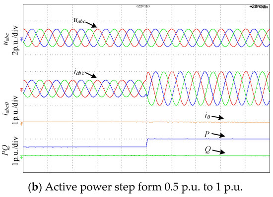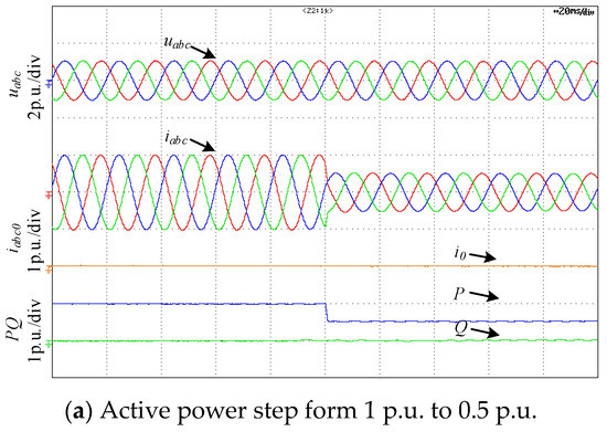 Figure 14 shows the effect of HFR control strategy on the dynamic performance of fundamental frequency control. Figure 14a shows the voltages, currents of and powers of the TFSCI when the active power step form 1 p.u. to 0.5 p.u., Figure 14b shows the voltages, currents of and powers of the TFSCI when the active power step form 0.5 p.u. to 1 p.u. It can be seen from Figure 14 that the proposed control strategy hardly has negative effect on the dynamic performance of fundamental frequency.