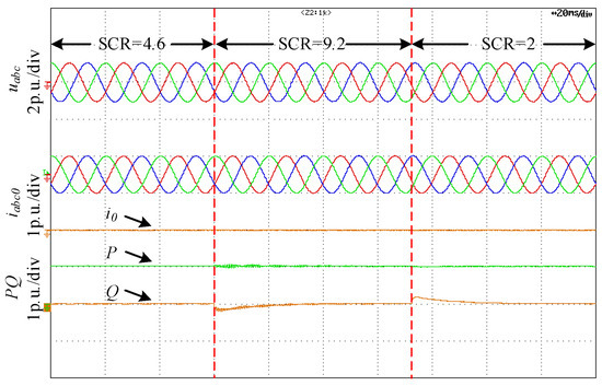 Figure 15 shows the adaptability verification of the proposed control strategy to the variation of the power grid short-circuit ratio. Figure 15 shows the voltage, current, and power waveforms of the inverter when the short-circuit ratio of the grid changes from 4.6 to 9.2 and the short-circuit ratio changes from 9.2 to 2. When the short-circuit ratio changes, the inverter can still remain stable and well HFR suppression performance, indicating that the proposed high-frequency oscillation control strategy has strong adaptability to the changes in the grid impedance.