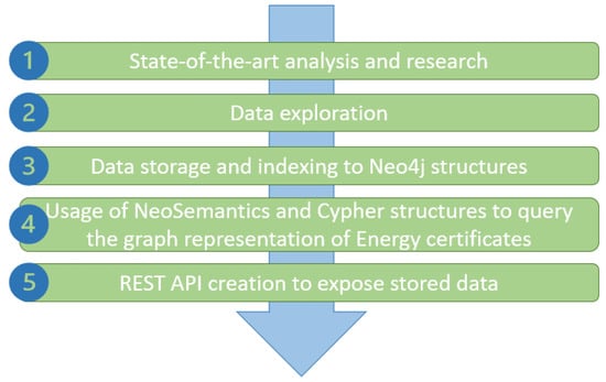 The methodology, depicted in Figure 1, for the proposed Reasoning Engine architecture is based on the results of the state-of-the-art analysis and research and the need that arises for extracting information by leveraging rules and axioms from energy efficiency certificates. The next step was the identification of the datasets that could be potentially used for graphical representation. Then, the technical phase initiated with the consumption of the dataset using Confluent Kafka and the persistence and indexing of Neo4j graph storage. NeoSemantincs and graph data science plugins of Neo4j enabled the querying of stored data and finally the creation of REST APIs to expose the querying results.