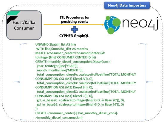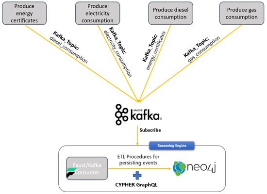 Figure 3 depicts the data flow in the Reasoning Engine Kafka consumer. More specifically, the EREN data are produced in four different Kafka topics (each topic is related to building data and attributes such as energy certificates, electricity, gas, and diesel consumption). The Faust/Kafka consumer is subscribed to all these topics, and it receives the incoming events. Following, it performs ETL (extract, transform, and load) procedures using the Pandas framework (https://pandas.pydata.org/ accessed date 20 December 2021), Neo4j Python Driver, and CYPHER GraphQL in order to persist them in the Neo4j graph database.