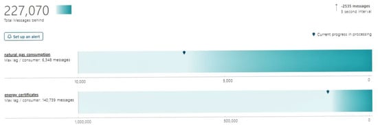 The data from the data pre-processing and semantic enrichment module are produced to Apache Kafka in JSON format. The EREN energy certificates, electricity consumption, diesel consumption, and gas consumption data are produced, respectively, to the topics “energy_certificates”, “electricity_consumption”, “diesel_consumption”, and “gas_consumption”. The Reasoning Engine Kafka consumer is subscribed to these four different topics and receives the data using the window functionality of Python Faust library in order to operate batch insert functionalities in the following steps. Figure 6 demonstrates the queued data in the Reasoning Engine consumer.