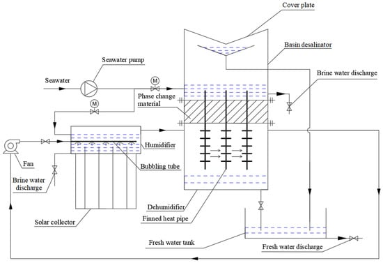 Figure 1 shows an integration HDH solar desalination process, which was a closed air open water (CAOW) system proposed by the author. In the process, the active HDH process and the passive basin desalinator jointly produce fresh water. In the active HDH process, the air is transported to the bubbling pipes in the humidifier by fan. The air is heated and humidified by seawater in the humidifier, and the seawater is heated by the solar collector. The hot and wet air from the humidifier enters the dehumidifier, where the air exchanges heat with the finned heat pipes, condenses fresh water, and releases vapor condensation latent heat. The heat released by air is transferred to the PCM and seawater in the basin desalinator by heat pipes. When the active HDH process stops work, such as after sunset, the PCM releases its stored heat into the seawater in the passive basin desalinator above it. In the basin desalinator, the seawater heats and humidifies the air above it, and the wet air condenses on the cover plate above the basin desalinator to produce fresh water for the second time. The seawater is intermittently replenished into the humidifier and passive basin desalinator by pump, and the brine water in them is discharged regularly.