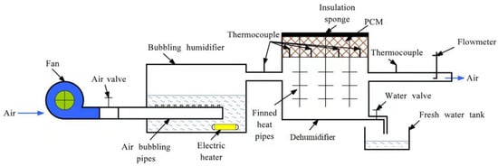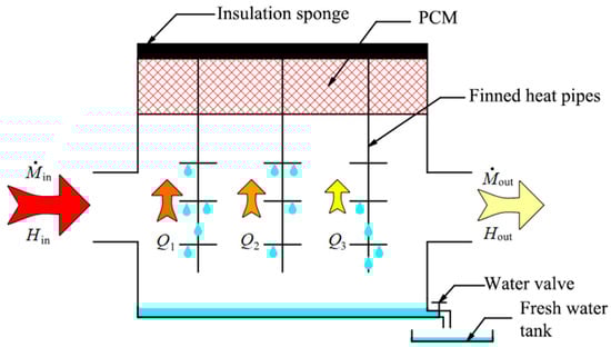 The experimental system of the phase change heat storage dehumidifier is shown in Figure 2, and its heat exchange diagram is shown in Figure 3. Min and Mout are the air mass flow at the inlet and outlet of the dehumidifier separately, kg/s; Hin and Hout are the total enthalpy of air at the inlet and outlet of the dehumidifier, J; Q1, Q2, and Q3 represent the heat exchange capacity by different heat pipes respectively, J. The performance indexes of instruments and equipment used in the experimental system are listed in Table 1. The phase change heat storage dehumidifier consisted of a PCM heat storage and a dehumidifier. The PCM heat storage was filled with PCM and is located on the upper part of the dehumidifier. The heat pipes were placed vertically between the PCM heat storage and the dehumidifier. As shown in Figure 3, the hot and wet air flowed through the dehumidifier from left to right and exchanged heat with the lower part of finned heat pipes in the dehumidifier, and the air was cooled to release heat and condense fresh water in the process. The heat released by the air was transferred upward to the PCM through the heat pipes and stored therein. In the actual HDH solar desalination process with the phase change heat storage dehumidifier, a basin desalinator was set above the PCM heat storage, and the upper end of the heat pipe extended into the seawater of basin desalinator. When the seawater temperature in the basin desalinator was lower than the phase change temperature of the PCM, the PCM released the previously stored heat to seawater so that the passive air humidification-dehumidification desalination process occurred in the basin desalinator, which can produce additional fresh water for the second time to further improve the fresh water output and the gained output ratio (GOR) of the whole unit. In order to simplify this experimental study, there was no basin desalinator above the phase change heat storage dehumidifier in the experimental system.