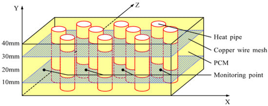 Four thermocouples were arranged in the PCM to monitor temperature changes. The locations of the measuring points are shown in Figure 5 and their coordinates are shown in Table 3.