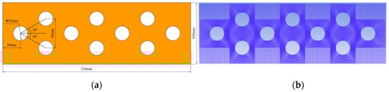 The two-dimensional numerical calculation model for the heat transfer of the PCM and heat pipes is consistent with the experimental device, and the model and its structured grids are shown in Figure 6. The following assumptions were made for this model: (1) The density term satisfies the Boussinesq hypothesis, only the density change caused by temperature change is considered; (2) The wall thickness is 0; (3) The dynamic viscosity and thermal expansion coefficient of the phase change material are constant; (4) The heat transfer on the inner wall is under a constant wall temperature condition; (5) The phase change media is isotropic.