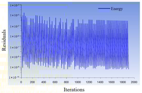 In the simulation calculation, setting the time step size as 0.3 s, the number of time steps is 24,000, that is, 120 min, and the max iterations/time step is 100. The numerical simulation task of this work was completed by 12 CPU cores, and their average CPU time for calculating 15 s is 86.05 s. Figure 7 shows the residual errors of the energy equation, which were less than 1 × 10−4, thus meeting the calculation accuracy requirements.