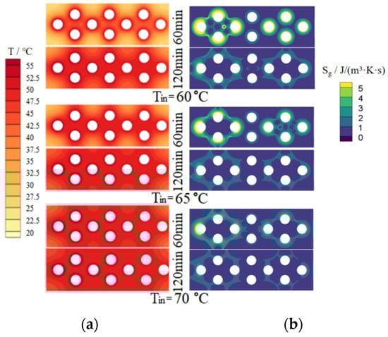 As shown in the right column of Figure 8 and Figure 9, the ranges of entropy generation rate of PCM-1 and PCM-2 were 0~14.32 J/(m3·K·s) and 0~4.89 J/(m3·K·s). Under the same conditions, the thermal entropy generation of PCM-1 was greater than that of PCM-2 because the thermal conductivity of PCM-1 was greater than that of PCM-2 and their temperature fields were different. With the increase of heating time, the thermal entropy generation decreased; with the increase of the hot and wet air temperature at the inlet of the dehumidifier, the thermal entropy production decreased. The maximum temperature gradient was on the left side of the cloud image, so the maximum thermal entropy generation was also in there. The temperature gradient in the middle region of the cloud image was relatively small, and therefore the thermal entropy generation in there was also relatively small. The minimum thermal entropy generation appeared at the corner of the cloud image, where the heat transfer caused by the temperature difference was low.