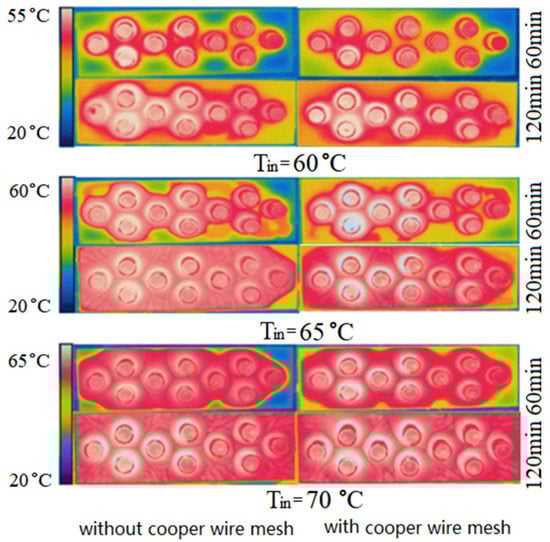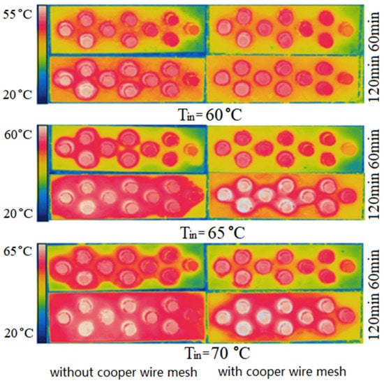 Figure 10 and Figure 11 show the experimental temperature fields on the upper surfaces of PCM-1 and PCM-2, in which the left and right columns are the temperature fields without and with copper wire meshes respectively. In the left column, the variation law of temperature field with parameters is consistent with the simulation results in Section 4.1.1.