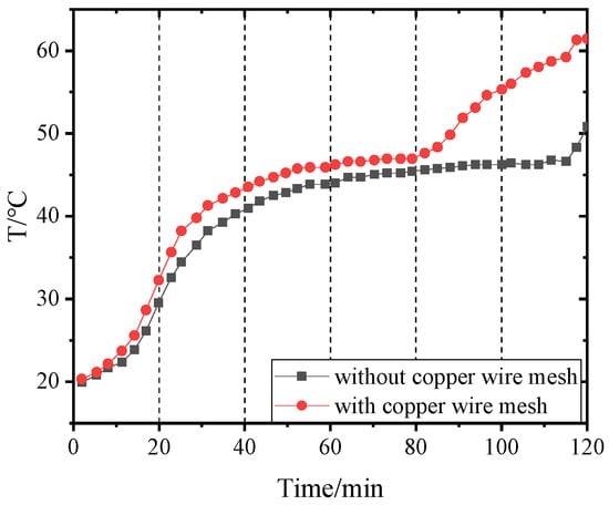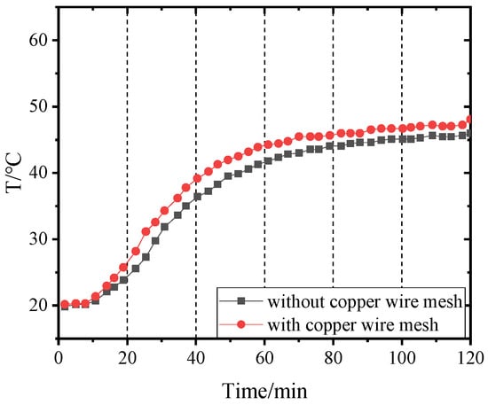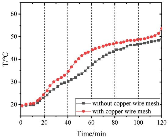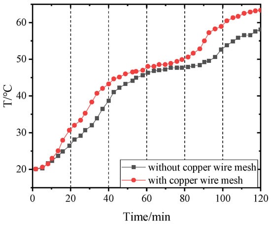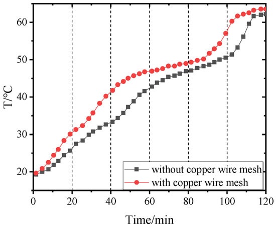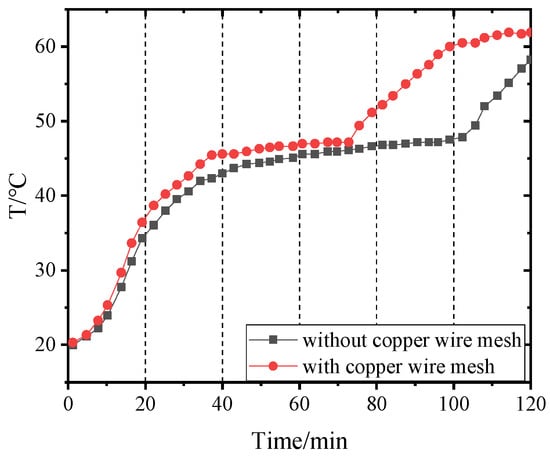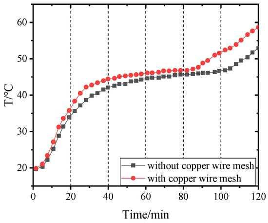 When PCM-2 was used for testing, the time required to reach phase transition temperature with copper wire meshes at the four monitoring points was 21 min, 18 min, 21 min, and 27 min respectively, which was 25.0%, 24.0%, 24.1%, and 24.3% shorter than that without copper wire meshes. Compared with before and after adding copper wire meshes, the maximum temperature differences of the four monitoring points during the experiment were 8.9 °C, 7.9 °C, 9.7 °C, and 7.9 °C respectively.