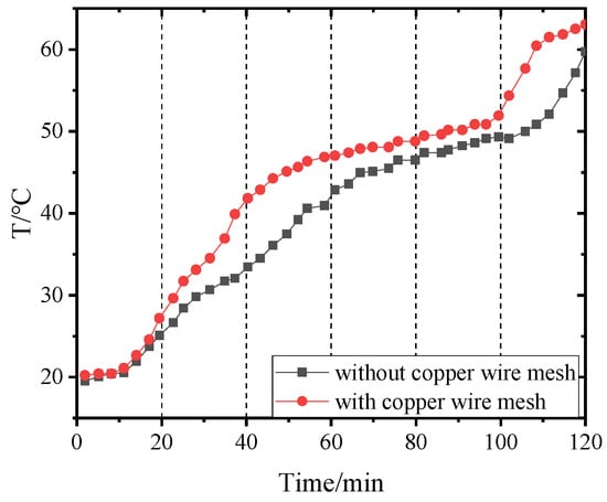 - After adding copper wire meshes to the PCMs, the temperatures of each monitoring point increased significantly. The times required for each monitoring point in PCM-1 and PCM-2 to reach the phase change temperature were 17.1–28.9% and 24.0–25.0% shorter than without copper wire mesh respectively. The residence times of each monitoring point near the phase transition temperature of PCM-2 were shorter than those in PCM-1.