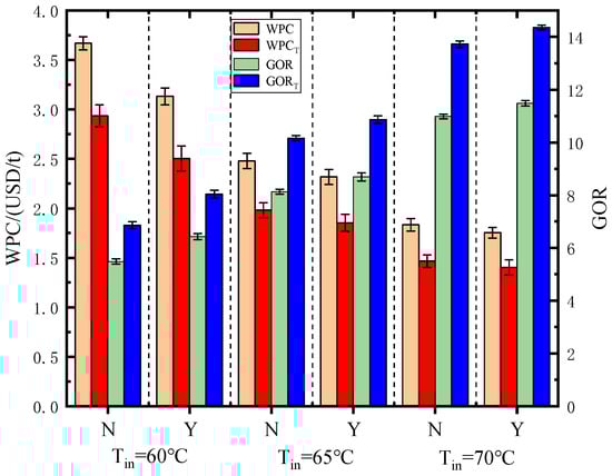 If the heat stored in the phase change heat storage is supplied to a passive basin desalinator to produce fresh water for the second time, according to experience, the heat utilization rate of the basin desalinator is generally less than 30% [34]. Assuming that its actual heat utilization rate is 25%, then the total fresh water output will increase by 25%. According to the Formulas (10) and (11), it can be calculated that after the basin desalinator is adopted, the GOR and WPC of the dehumidifier will increase by 25% and decrease by 20% respectively. The increased total gained output ratio and reduced total water production cost are expressed by GORT and WPCT respectively.